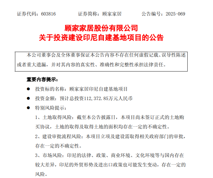 9月1日,顾家家居(603816)(603816.SH)公告称,公司拟投资112,372.85万元建设印尼自建基地项目,预计在全部建成后的3年内达纲,达纲时预计实现年营业收入约25.20亿元。项目建设期为4年,用地约19.56万方。项目存在土地取得、建设审批流程及市场风险。本项目布局印尼自建基地,有助于扩大生产规模、提高生产效益、缩短供货周期,更好地满足客户需求,进一步提升公司在软体家具行业内全球竞争力和市场占有率,巩固和增强公司在行业中的企业地位。